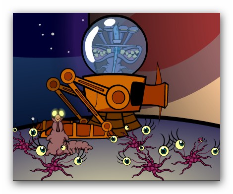 Красочная реализация известной задачи о перевозке с одного берега на другой, где в роли героев задачи выступают космические существа.